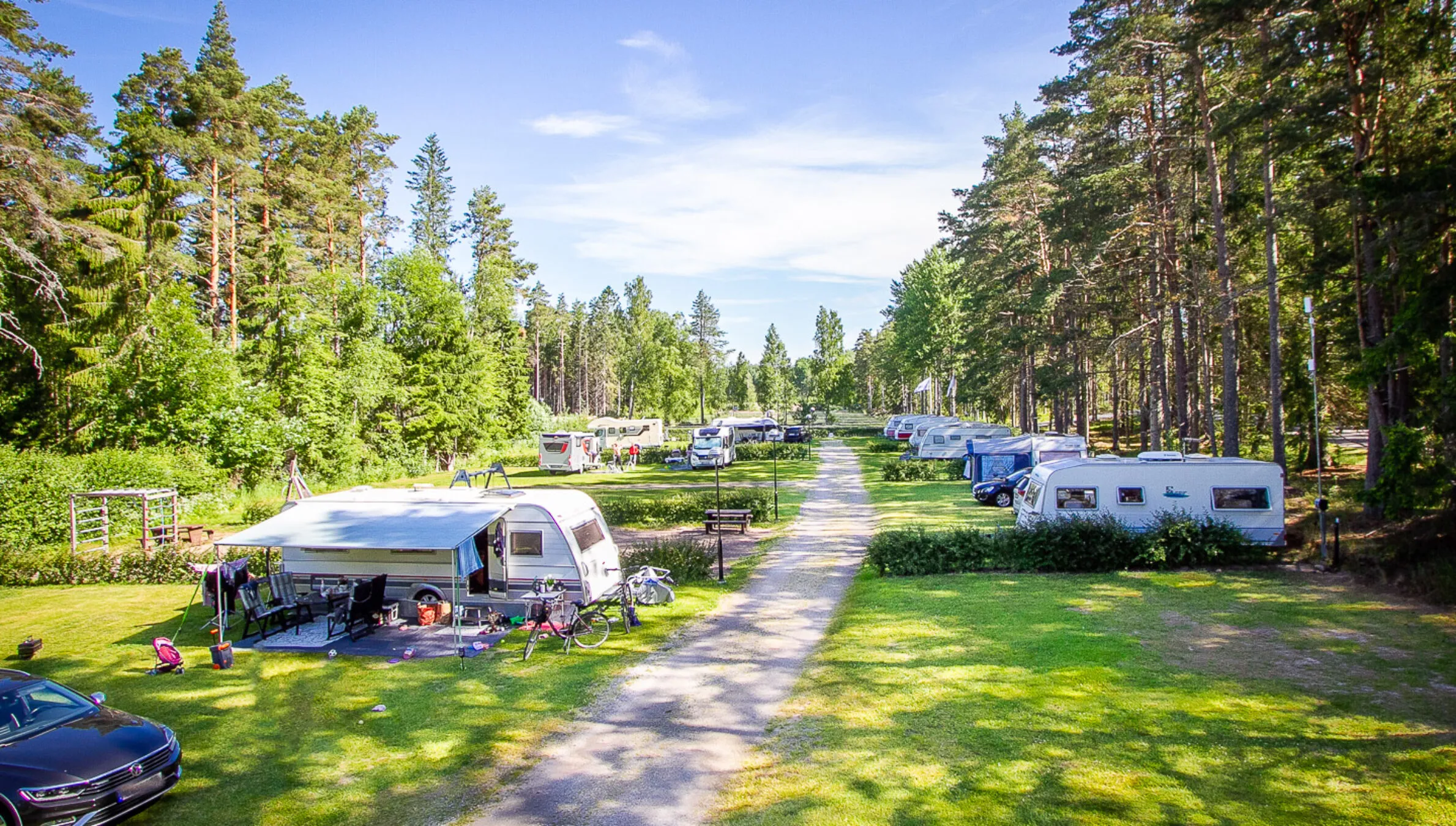 Centrala delen av campingen. Våra premiumplatser 501 – 510 för husvagn/husbil inkluderar el, vatten & avlopp. Hårdpackat grus för uppställning av husbil/husvagn med tillhörande grästomt.